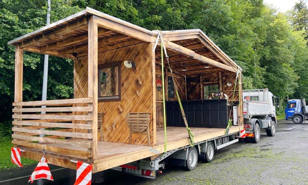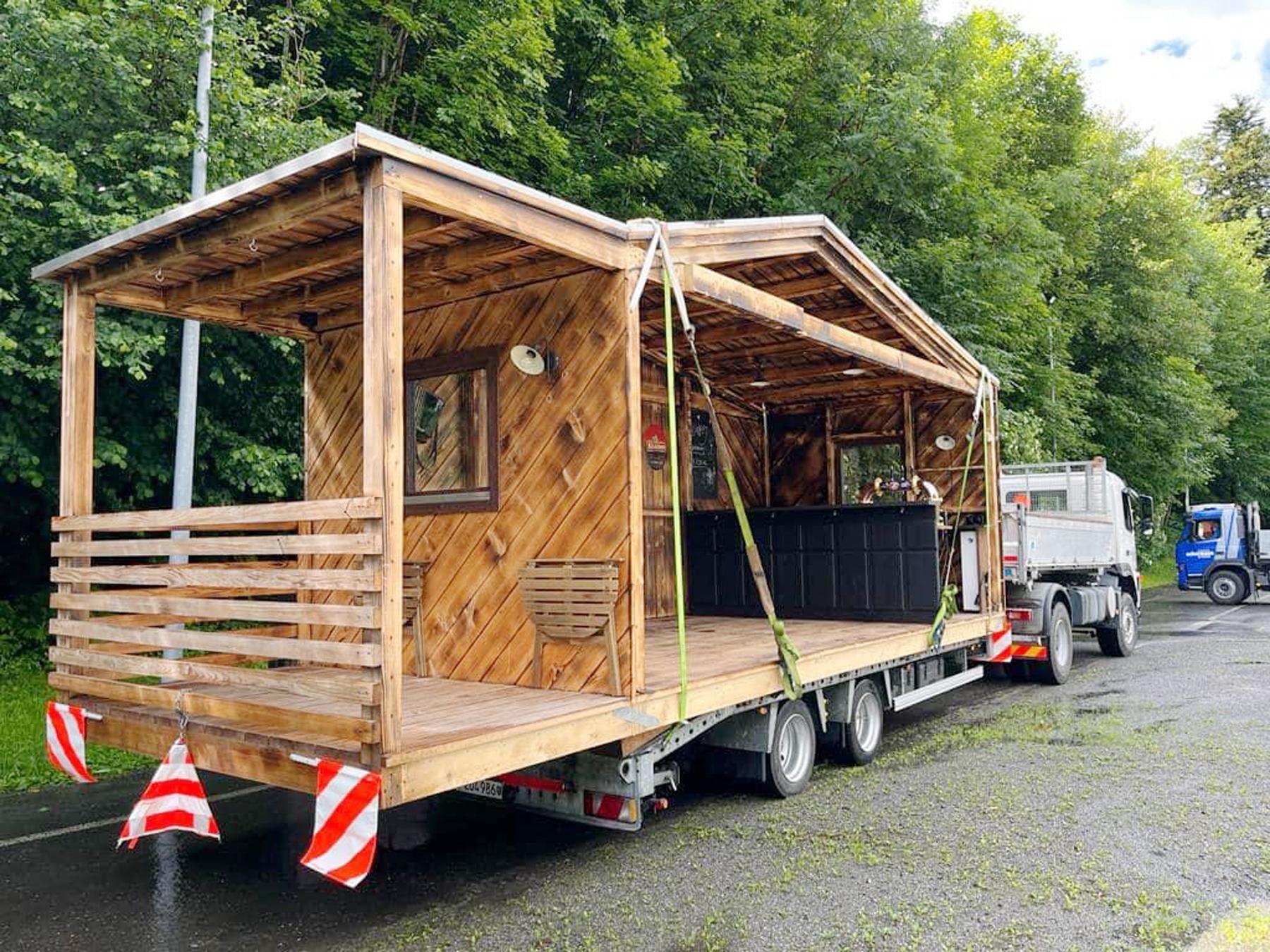 Das Pop-up-Pub besteht aus vier fertigen Modulelementen, welche aneinandergereiht und miteinander verbunden werden. Diese werden mittels LKW-Kran aufgeladen, an den Bestimmungsort transportiert und abgeladen. Der gesamte Transport und Auf-/Abbau wird von einer Person unsererseits begleitet.